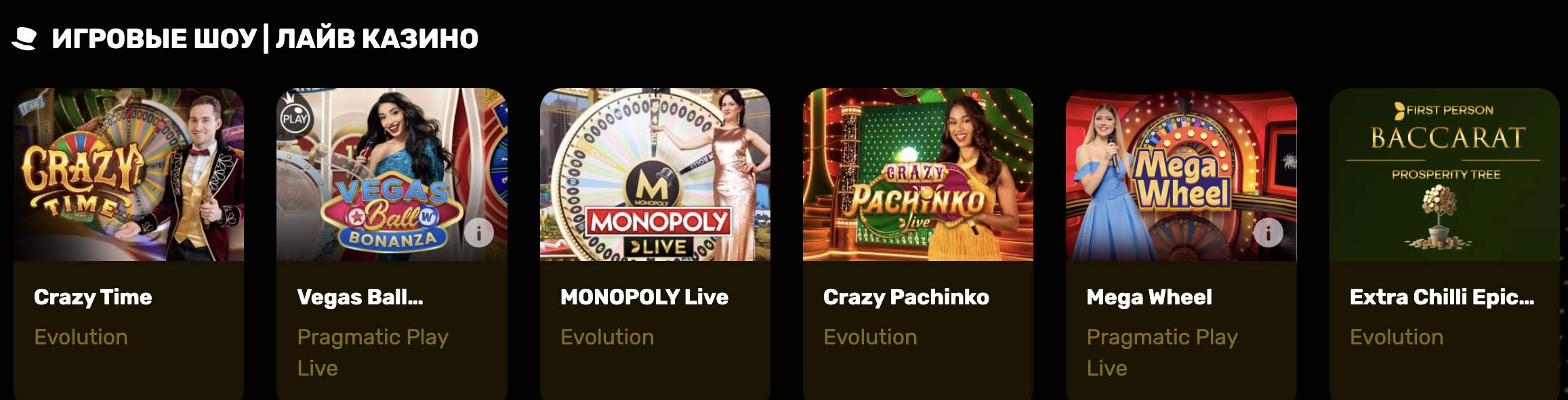 | 🎲Виды игр | Слоты, лайв-игры, настольные и карточные игры |